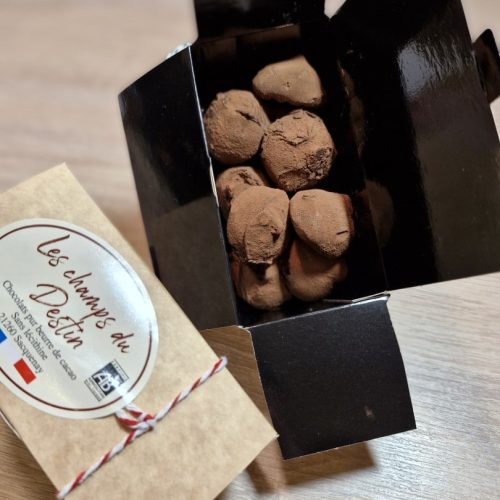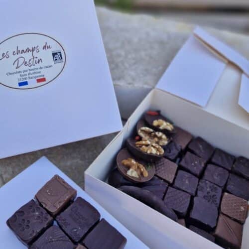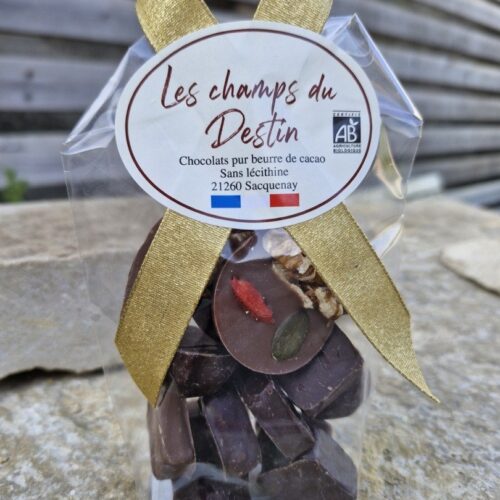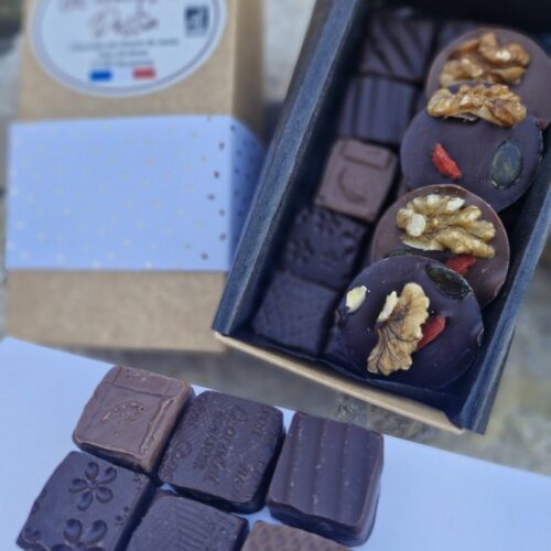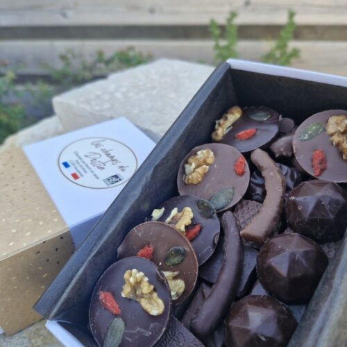 Ingrédients : Pâte de cacao*, sucre de canne*, poudre de lait entier*, vanille bourbon*,chocolat blanc*, colorant naturel à base de concentré de betterave, carthame et citron. sans lécithine